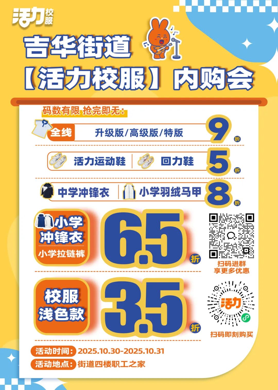 本次活动不只在线下带给大家便捷,也可扫码进入【活力校服】线上商城进行选购,直接寄到家。选择更丰富!